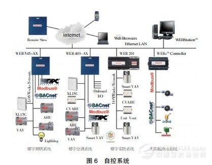 这个新型控制柜基于Niagara技术平台,采用楼宇自控系统所需的DDC控制模块做核心,能够兼容目前楼控行业的所有主流协议:BACnet/Lonworks/KNX/Modbus等,使太阳能系统能够十分容易的整体嵌入到楼控系统中,与暖通空调(HVAC)系统、照明系统、安全防范、消防、电梯系统和其他系统的出现在同一界面,统一操控管理,从而帮助设施管理人员、建筑业主以及系统集成商,进行同步、准确、最优化的控制,也实现了节能减排的最大化。在物理连接上也非常简单,只需一根网线把太阳能控制柜与楼控控制柜连在一起即可。见图6自控系统图。