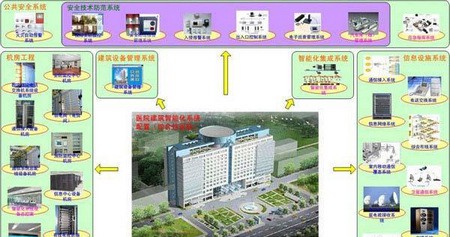 医院智能化系统除了具有一般智能建筑的特点外,还与护理学、卫生学、临床医学工程学等各种现代高新技术相互渗透和结合,所以常规智能化医院通常由四大系统组成,即通信网络系统、建筑设备智能系统、医疗设备智能系统、医院管理信息系统,并将这四大系统合理、科学的结合起来,实现系统的综合集成管理。