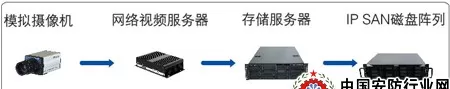 摄像机信号传输至视频编码设备(PC式硬盘录像机、嵌入式硬盘录像机、网络摄像机或网络视频服务器)中,视频编码设备把视频数据编码成IP视频流,通过以太网交换机传输至存储服务器,存储服务器中的视频处理软件以ISCSI方式将数据存入后端的IP SAN磁盘阵列(iSUM420G3)中,IP SAN磁盘阵列通过千兆主机通道与交换机的千兆口相连,可配置成失败接管或者MPIO负载均衡方式,保证性能及安全性。各终端或远程用户通过存储服务器可方便调用IP SAN磁盘阵列中存储的历史视频数据。