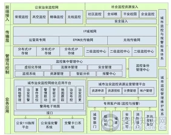 该“平安城市”解决方案立足核心软件应用技术自主研发,广泛支持市面上各类不同的监控前端产品,形成平安城市网格化应用。整个解决方案以应用为导向、服务社会治安管理以及可持续运营的设计理念,系统的总体架构图设计如下: