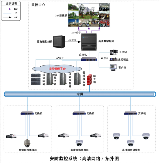 1)、本次建设视频安防监控系统采用基于IP网络架构的数字式视频安防系统,前端采用720P的高清网络摄像机(重点位置设置1080P),传输网络主干采用千兆,中心采用综合管理平台进行系统管理。