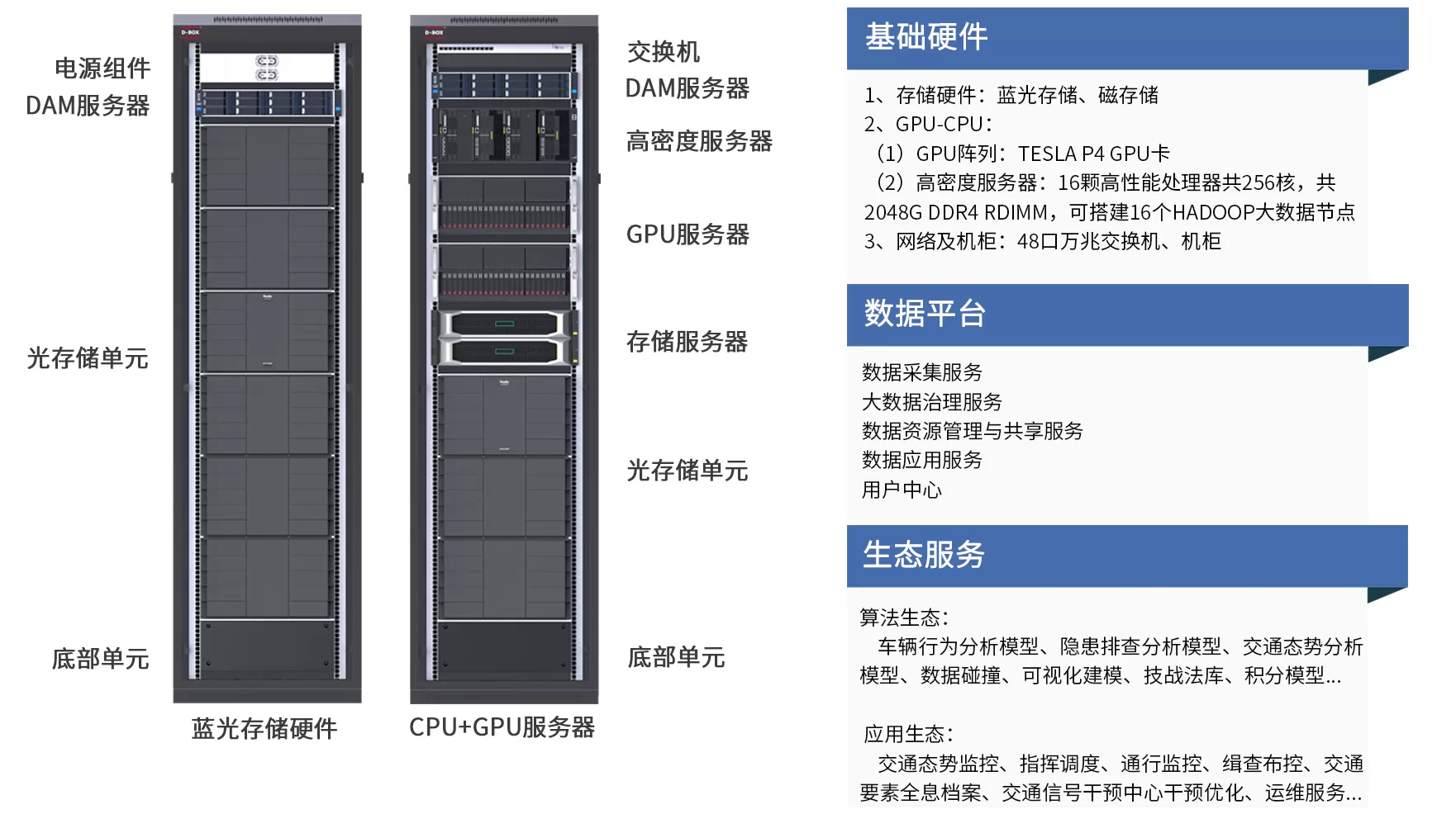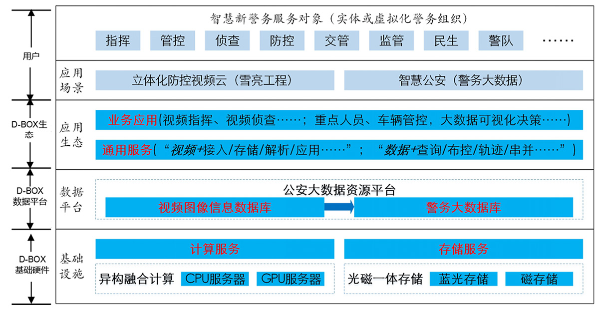 D-BOX是一个能为公安用户提供数据绿色安全存储和N次分析服务的轻量级DT系统,D-BOX的核心是基于蓝光数据沉淀的大数据应用,通过光磁融合存储构建存储力,通过CPU-GPU异构融合计算平台构建计算力,存储力实现价值数据的长期、安全保存,为计算力提供数据基础;计算力实现数据的N次碰撞、价值挖掘,为存储力提供更高价值密度的数据,存储力和计算力相辅相成,实现“存储过去、预知未来”。