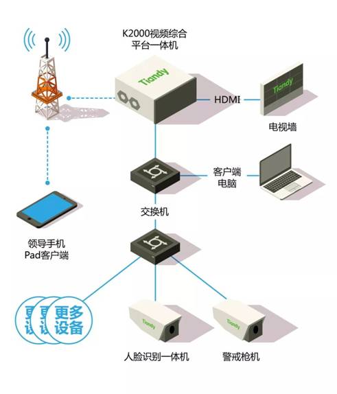后端采用K2000视频综合平台一体机对系统中音视频资源进行统一管理查看,以视频图像应用为手段,有效结合数据关联分析等技术手段实现对系统信息的比对、判断以及联动控制操作,集多种管理手段、分析处理手段于一体,最大程度地提高视频监控的作用和效率。