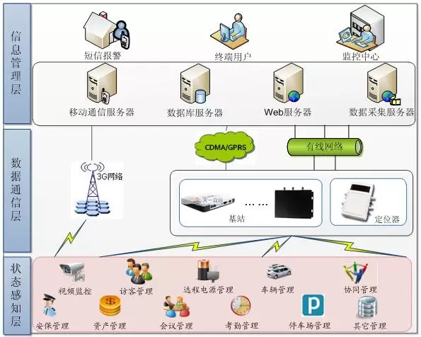相当于人体的神经系统,实现各种状态信息的实时感知和传输汇集功能。系统按照实际需要,为人员和物品配备相应的标识卡;同时,在区域内的合理位置安装信息采集设备,以实现各种状态和身份信息的实时感知,并将各种感知信息发送到数据中心。