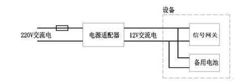 接入220V不间断线路,经电源适配器转换为12V直流工作电压,为基站设备供电。基站内部并联有12V蓄电池,以备意外停电时为信号网关提供电源。如下图所示: