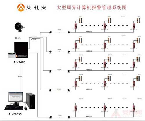 为了满足现场需求,我们在总线主机上加一个AL-7424四通道总线分离器,解决了一台主机支持五路总线的问题。并在每条线上接入屏蔽线。在前端使用ABH系列红外对射做为探测器,中间通过AL-7480-1A和总线与主机相接。具体如下图所示: