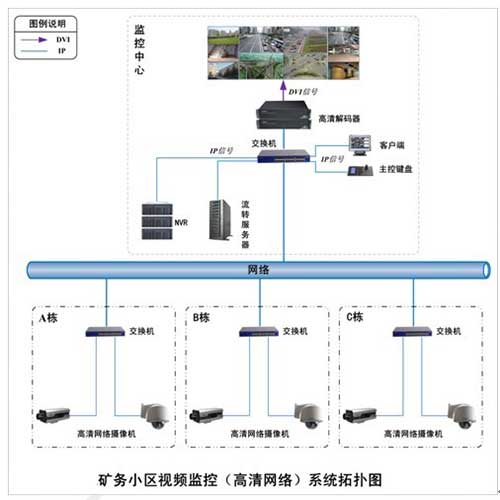 本系统主要由前端摄像机、传输链路、中心控制/显示部分组成。各监控点的摄像机通过网络把视频图像信号发送给监控中心,通过网络视频录像机(NVR)等设备进行存储,计算机都可以通过客户端对监控视频录像等数据进行查询服务;另一方面通过通过在控制中心设置的显示单元把多路监控图像实时的显示在值班人员的面前。