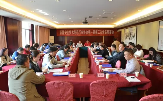 2014年9月23日,新安协第一届第三次常务理事会在乌鲁木齐召开。自治区公安厅督察总队总队长兼新疆安全技术防范行业协会理事长程浩斐,自治区公安厅科技信息化处正处级侦察员、新疆安防协会副理事长唐明,新疆安防协会副理事长兼秘书长邵永寿,以及新安协副理事长单位、常务理事单位的代表46人出席了会议。会议由程浩斐理事长主持。