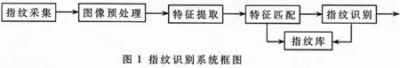 指纹识别系统是通过指纹采集、分析和对比指纹特征来实现快速准确的身份认证。指纹识别系统框图如图1所示。