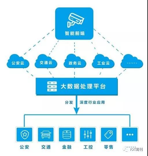 云,是一个中间件。之前做智慧城市、平安城市,大量的前端设备投入使用,但是信息共享却成为了很大的难题,专人专岗。管拍交通的不管治安,管治安的不管交通,管银行的就拍自个儿,包括之前的天网,都是专网专用,各部门之间不进行信息共享。前端是信息孤岛,需要一个分类的中间件将其整合后交付后端汇集,给出实时动态的结论。每个关键行业一朵云,无论前端是治安的、交通的、是超市、小区的、街道的、还是银行的、学校的,都会有行业属性和划分。将智能前端处理过后的数据和图像按照属性归类到其行业的云端,就实现了所谓的“信息共享”和“实时大联网”。