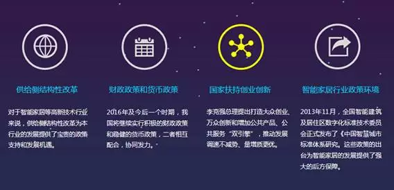 由于国家对于产能过剩的现状进行积极调节,精减传统行业,因此对于智能家居行业等高新技术行业来说,供给侧结构性改革为本行业的发展提供了宝贵的政策支持和发展机遇,将在宏观层面大大带动行业发展。