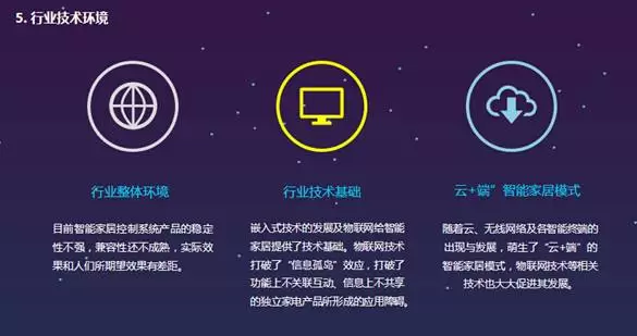 从以上的分析来看,“供给侧”给智能家居行业发展提供了宝贵的政策支持和发展机遇,将在宏观层面大大带动行业发展。人们的生活水平日益提高,消费能力也逐步增强,从讲究吃得饱穿得暖,转变为更加关注生活品质,给行业的创新带来新的方向。在技术方面现如今还不是很成熟,毋须加强。