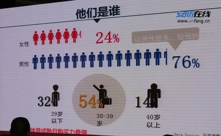 比如说在家装领域,根据这些数据,可以知道用户最近有没有装修的需求。同时还可以发现其中一些有意思的特征:男性居多,可能有比较强的购买力,女性仅占24%。而30到39岁人群是家装需求的主要人群,他们的购买能力最强,其次是29岁以下的结婚人群等。