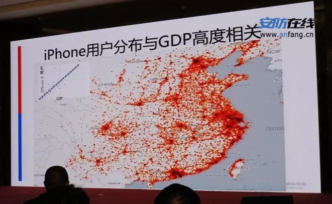 另外一个应用,百度数据还可以反应空间上经济形态的分布。来看全国iPhone6的分布,通过做了分析,可以看见省级的GDP和省iPhone6的分布是高度相关的,比较不相关的地方是北京、上海、深圳,我们发现这几个地方用户的行为更加复杂,用户的消费和其他地方的差异可能更大一些。 这对企业拓展市场有一定的指导意义。