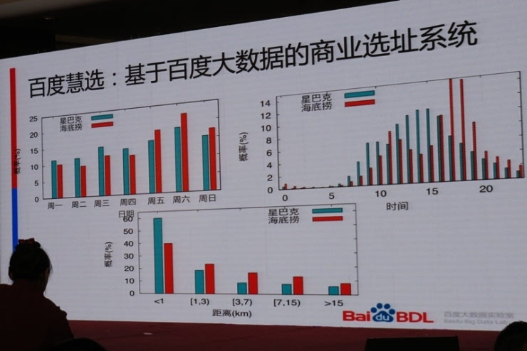 这个图反映的是用户去星巴克与海底捞的差异。星巴克用户周一到周五去的频率比较高,去海底捞周末频率比较高。包括大家在每一天的时间,对于像星巴克,大家下午三四点去的概率最高,去海底捞大家下午六点到九点去的频率比较高。对于地点的需求也不一样,用户宁可走远一点去选一个更合适的海底捞,而对于星巴克,他们更愿意选择近的地方。