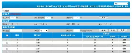 通过登录网管型PoE交换机的PoE管理页面,用户可以设置开启/关闭PoE功能,设置输入功率,最大过载、预留功率等等。
