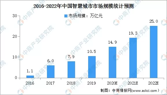 【安防在线 www.anfang.cn】随着我国稳定的经济增长及技术水平的提高,智慧城市市场规模日益扩大。根据中国智慧城市工作委员会数据,2020年我国智慧城市市场规模将达14.9万亿元。预测到2022年,我国智慧城市市场规模将达到25万亿元。