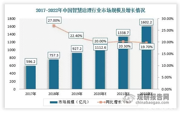 根据观研报告网发布的《中国人工智能解决方案行业发展趋势分析与投资前景预测报告(2022-2029年)》显示,人工智能解决方案在智慧治理领域的提供方主要服务公安、政法、交通、应急、文教卫、社区园区等政府和大型企事业客户。根据数据显示,2019年,中国智慧治理市场规模达到927.23亿元,预计2022年有望突破1600亿元,2019-2022年的复合增长率为19.7%,未来发展空间巨大。