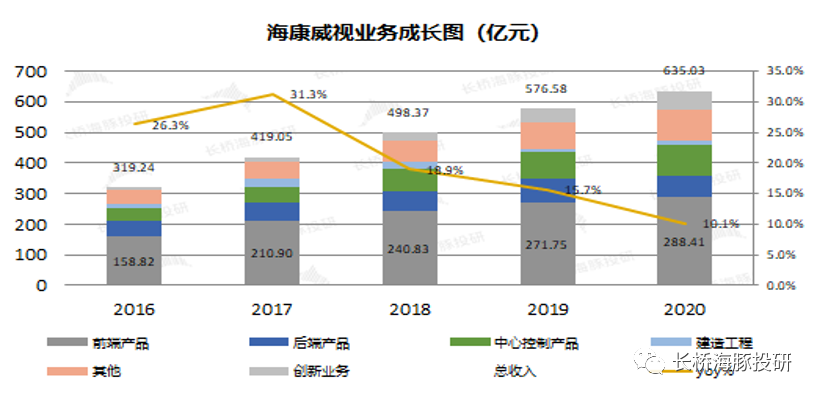 海康威视在2020年已经成为超过600亿营收体量的行业巨头,在疫情来临之下,公司的规模不降反而继续保持两位数增长。从公司年报披露看,主要以产品类型进行区分。其中公司前端产品仍是公司最主要的收入来源,业务分项上仍以视频监控产品为主。