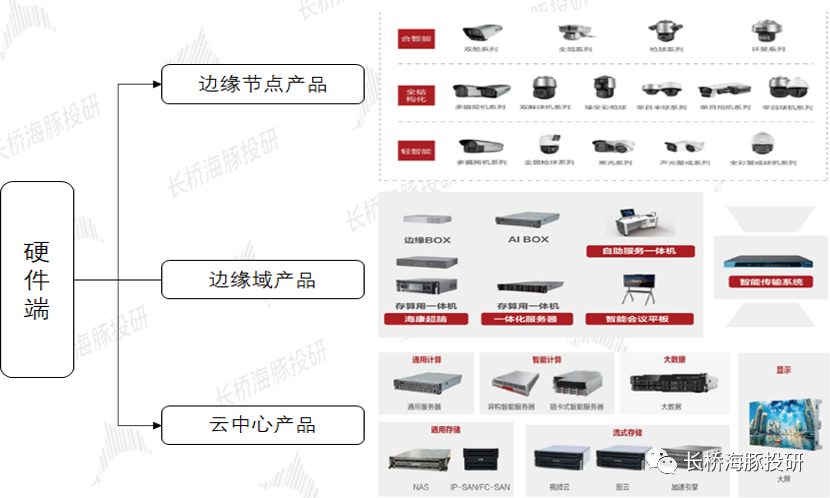 海康威视硬件端的产品比较丰富,主要以安防一体化解决方案的模式进行布局。目前硬件端主要涵盖边缘节点产品、边缘域产品和云中心产品,以构成整个“获取-计算-存储”的安防系统。