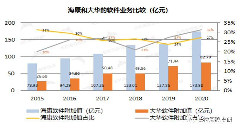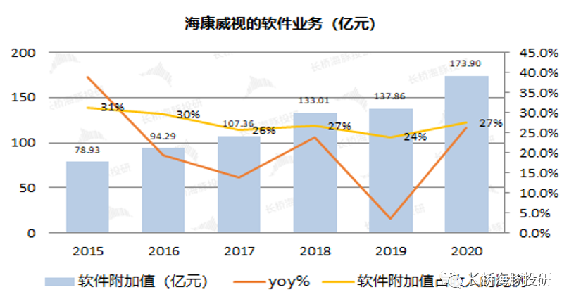 长桥海豚君测算,海康威视的软件业务收入在2020年达到了174亿元,软件业务连续10年实现正增长。2020年的疫情影响公司硬件端的销量,但并不影响软件端的继续增长。