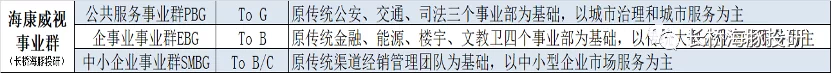 海康威视2018年进行业务架构变革,成立了公共服务事业群PBG、企事业事业群EBG、中小企业事业群SMBG。针对不同的事业群,公司会采取不同的业务策略,提供不同的产品和系统解决方案。