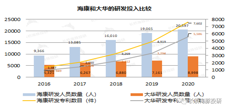 海康每年增长的研发投入下,构建了庞大的研发团队。截至2020年末,公司的研发团队已经达到2万多人,两倍于大华的研发人员规模。在公司持续的研发投入下,海康的研发专利数目持续高增,领先于大华2000多件。