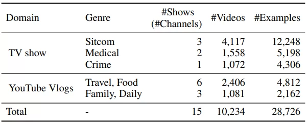 这批视频数据分成两类,电视节目以及来自 YouTube 的 Vlog。
