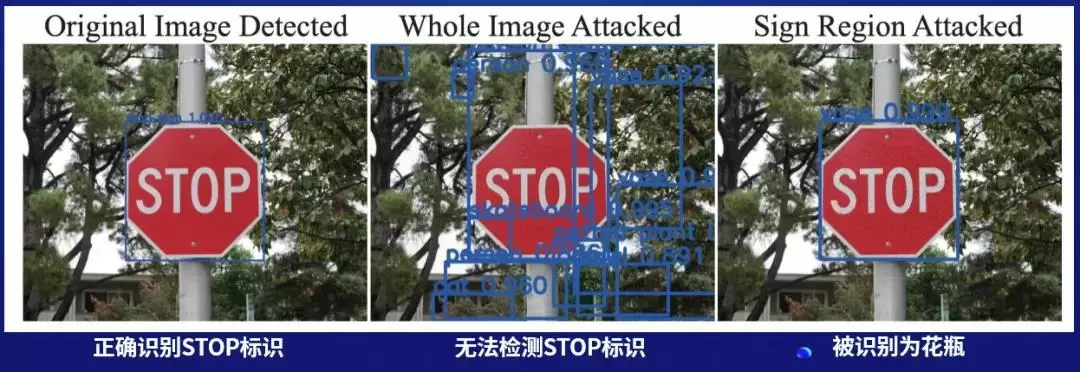例如在自动驾驶上,通过对一个实体停车标志经过精心设计的噪声扰动后,使目标检测系统无法准确识别标志,从而可能造成交通事故。