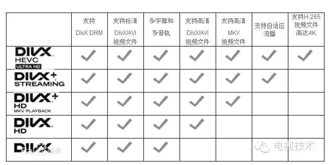 2.DivX是一种数字视频格式,支持MPEG-4,H.264和最新H.265标准的视频,分辨率可高达4K超高清。DivX已于2013年9月推出全球第一款支持H.265标准,可进行4K超高清视频编解码的软件。DivX认证过程必须经过严格测试,测试要求包括:VIDEO、AUDIO及多媒体要求等,通过认证可满足高可视标准质量要求。DivX对消费电子设备进行认证,按照屏幕尺寸大小、所能支持的分辨率高低、是否可以联网流播,从手机、平板、DVD机、机顶盒、PS3到蓝光机、全高清(1080p)电视机,再到超高清(4K)电视机,DivX都有对应的认证等级与其匹配。图1列举了DivX认证由低到高的等级,高等级向下兼容低等级的功能。