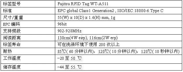 基于此,富士通开发了一款耐水、耐热、耐压、耐碱性的UHF频段RFID标签WT-A511,可以让RFID科技能应用于制服的管理上。并且该标签的可以重复利用的特性大大提高了她的性价比,使标签的平均每次使用成本降得很低。目前,世界上已经有多家宾馆,医院,游乐园采用了该标签来管理他们的制服,不仅有效提高的制服管理的效率还大大地降低制服管理的人力成本。而在中国,该标签已经被广泛的应用于医院的病服以及医院的床单被罩管理系统。
