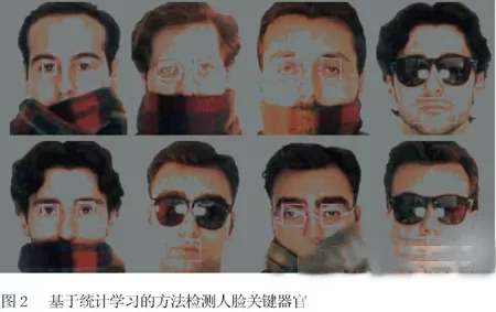 从技术角度分析,由于异常人脸出现在场景中时缺乏完整的人脸模式,所以识别算法只能在局部的人脸器官的检测上寻求出路(如图2),这本身就增加了误识别的几率。试想如果以人脸上的嘴这个器官为检测对象,采用与人脸检测类似的基于统计学习的分类器,我们更难把嘴和类似嘴特征的模式很好地区别开。统计方法通常是在场景中寻找嘴、眼睛等模式,但是如果出现在ATM机前的异常人脸如果把眼睛和嘴都遮挡住,分类器将无法发现那些学习时记住的模式。实际工程中,关于这项功能发生误报和漏报的记录是最严重的。原因大概为目前大部分厂商采用的算法都具有相当的权宜性质,如为了完成客户提出的这项要求没有深入就专题进行研究,而是默认出现在ATM机前的运动目标(基本是头肩序列)就是人脸,然后如果长时间检测不到正常的人脸模式就认为是异常人脸,这种肤浅的工程做法必然致使在实际的场景干扰下检测率大大降低。