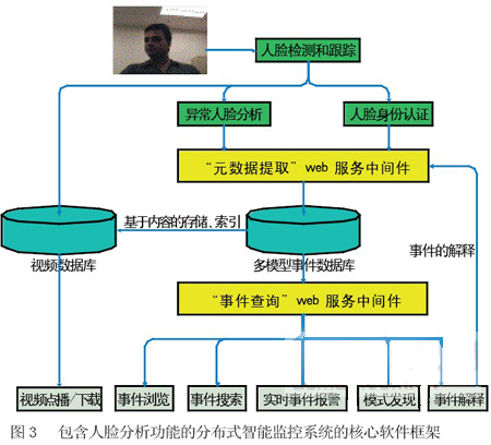 在基于分布式的网络环境下,当符合录像条件时,智能终端机设备先把视频源的数据压缩成码流,然后以TCP/IP流的形式传到视频数据库中存储起来。人脸分析的结果被描述成结构化的元信息,打包后传输到服务器端,由中继数据存储中介软件把它们装入多模型事件数据库。当客户端有检索要求的时候,服务器端的检索服务中介软件把提交的请求解释成符合特定文法结构的查询命令,首先在事件数据库中找到最匹配的事件描述记录,然后再通过关联技术从对应的视频数据数据库中提取压缩的视频片段,以备回显(见图3)。