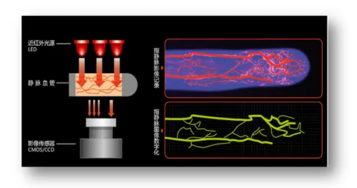 人体静脉中红血球的血红素是氧气的还原血红素,还原血红素会吸收近红外线,因此当近红外线照射到手指时,只有静脉部分才会有微弱的反射,从而形成静脉纹路图像,而使用特定波长光线对手指进行照射可得到手指静脉的清晰图像。利用这一固有的科学特征可对获取的影像进行分析、处理,从而得到手指静脉的生物特征。