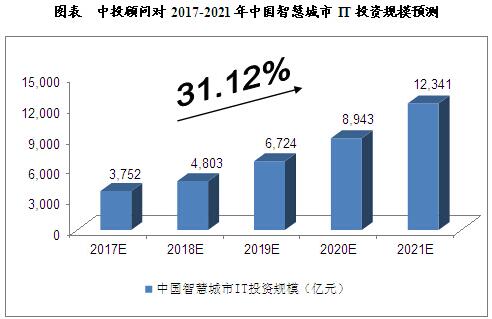 综合以上因素,我们预计,2017年我国智慧城市IT投资规模将达到3,752亿元,未来五年(2017-2021)年均复合增长率约为31.12%,2021年IT投资规模将达到12,341亿元。