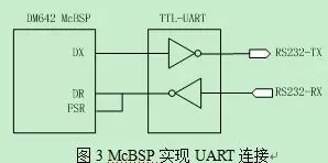 UART由于其操作简单、工作可靠、抗干扰强等特点,在嵌入式系统得到广泛应用。DM642没有原生UART接口,但是具有功能强大的McBSP接口,通过简单修改串口控制寄存器,可以实现UART功能接口,常规有两种做法:串口模式和通用输入输出模式。本文采用了串口模式。DM642与串口电平转换(TTL-UART)芯片MAX3232的连接关系如图3所示。DM642将每个UART位作为一个16比特字,即UART的位“0”在McBSP中即为0x0000,而UART的位“1”在McBSP中即为0xFFFF。实际编程处理中,为增加对噪声的干扰能力我们加权处理了16比特字中间位数据。