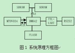 系统基本原理如图1所示,CMOS芯片与DM642采用Raw Capture模式连接,DM642通过I2C接口对CMOS芯片进行寄存器配置读写操作。系统扩展两片SDRAM芯片作为运行内存,FLASH用来保存系统程序。DM642通过RS232串口方式将算法运行结果发送给上位机,同时接收来自上位机的命令。DM642本身没有原生UART串口,这里我们使用McBSP串口来模拟UART串口。