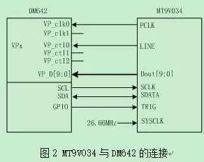 DM642共有三个可配置视频端口,它们可配置为视频捕捉模式,视频显示模式或者传输流接口TSI捕捉模式。每个端口由两个通道组成。视频端口可通过配置以便支持多种视频标准。当被配置为视频捕捉模式时,每个视频端口可以作为两个视频捕捉通道使用,其中每个通道可支持8/10位BT656或者RAW视频数据格式;也可以作为一个视频捕捉通道,可以支持8/10位BT656、8/10位RAW视频、16/20位Y/C视频、16/20位RAW视频或8位TSI等数据格式。本文使用了VP2端口,将其配置为单通道8位RAW视频捕捉模式。MT9V034芯片的寄存器地址为8位,寄存器数据为16位。DM642通过I2C串口可对MT9V034的寄存器进行参数控制,如图像分辨率、行场消隐、快门宽度等。MT9V034与DM642之间的硬件连接关系如图2所示。