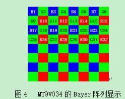 彩色图像通常由三种颜色组合生成,最常用的就是红绿蓝(RGB)三色。但是基于成本的考虑,大多数芯片在单像素位置上只会有单一颜色感应器。最普遍使用到的色彩滤波阵列(CFA)为Bayer阵列。Bayer阵列中50%像素为绿色,红色和蓝色各占25%。这主要是因为人眼对绿色最敏感。MT9V034采用的Bayer阵列如图4所示。