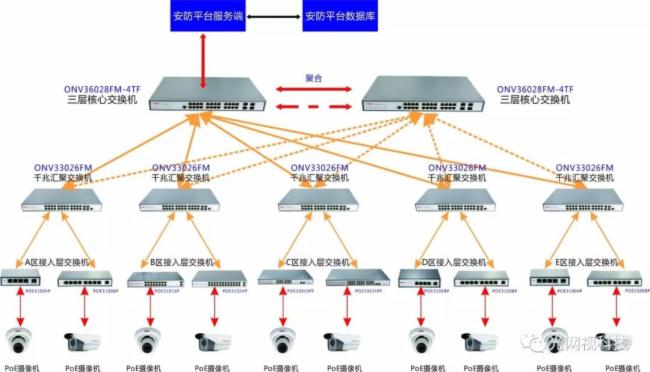 通常将网络中直接面向用户连接或访问网络的部分称为接入层,将位于接入层和核心层之间的部分称为分布层或汇聚层,接入层目的是允许终端用户连接到网络,因此接入层交换机具有低成本和高端口密度特性。汇聚层交换机是多台接入层交换机的汇聚点,它必须能够处理来自接入层设备的所有通信量,并提供到核心层的上行链路,因此汇聚层交换机具备更高的性能,更少的接口和更高的交换速率。而将网络主干部分称为核心层,核心层的主要目的在于通过高速转发通信,提供优化、可靠的骨干传输结构,因此核心层交换机应用有更高的可靠性、性能和吞吐量。