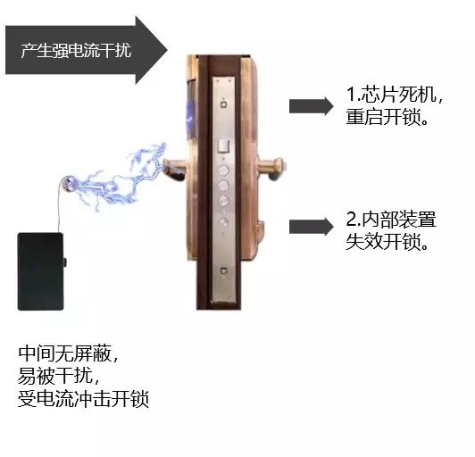 特斯拉线圈是一种分布参数高频串联谐振变压器,其产生的强电磁脉冲在攻击智能锁芯片之后,会造成芯片死机并重启而导致自动开锁。