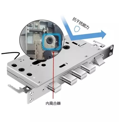 锁的电机、离合器都设置在锁体中,当电子钥匙操控锁体中的离合器,前执手通过离合器开、关主控锁。电机、离合器被保护在锁体中,加倍提升抗干扰能力。