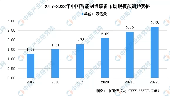 目前已初步形成以自动化生产线、智能检测与装配装备、智能控制系统、工业机器人等为代表的产业体系,产业规模日益增长。根据赛迪智库数据显示,2018年我国智能制造装备市场规模超过1.51万亿元,2020年市场规模可达到2万亿元。未来,在“中国制造2025”战略的不断落实与推进以及物联网、云技术、人工智能等新兴技术的推动下,我国智能装备行业将保持较快增长。中商产业研究院预计,2022年我国智能制造装备市场规模将超2.6万亿元。