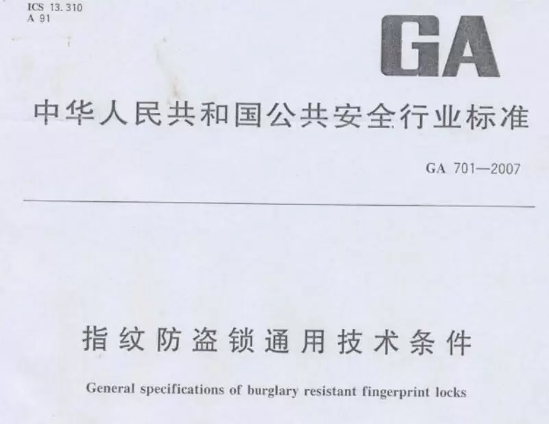 GA701-2007《指纹防盗锁通用技术条件》规定了指纹防盗锁的通用技术要求和试验方法,是设计、制造和检验指纹防盗锁的技术依据。适用于以指纹作为输入信号,识别、处理其相关信息,以电动方式控制机械锁定结构启、闭的具有一定防破坏能力的锁。
