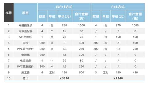 交换机、电源适配器、网线、电源线、人工成本等成本在内,非PoE供电的项目成本大约为3300元,PoE供电方式的成本为2340元。PoE方式可以节约30%左右的成本。