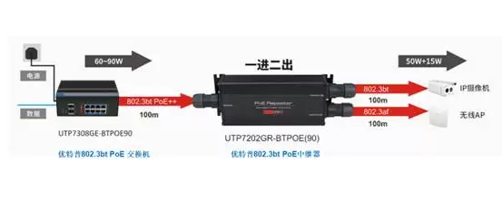 优特普自主研发的全千兆802.3bt PoE网络中继器采?大功率PoE供电技术,可将1000Mbps以太?信号及PoE供电延长100米。