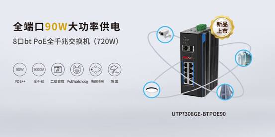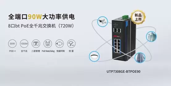 以优特普全端口90W bt PoE交换机UTP7308GE-BTPOE90为例,产品支持IEEE 802.3bt标准,8个端口同时输出90W PoE功率,整机PoE最大功率可达720W,可广泛应用于大功率高速球机、11ac无线AP、智慧照明、数字标牌显示系统等设备的供电和网络传输。