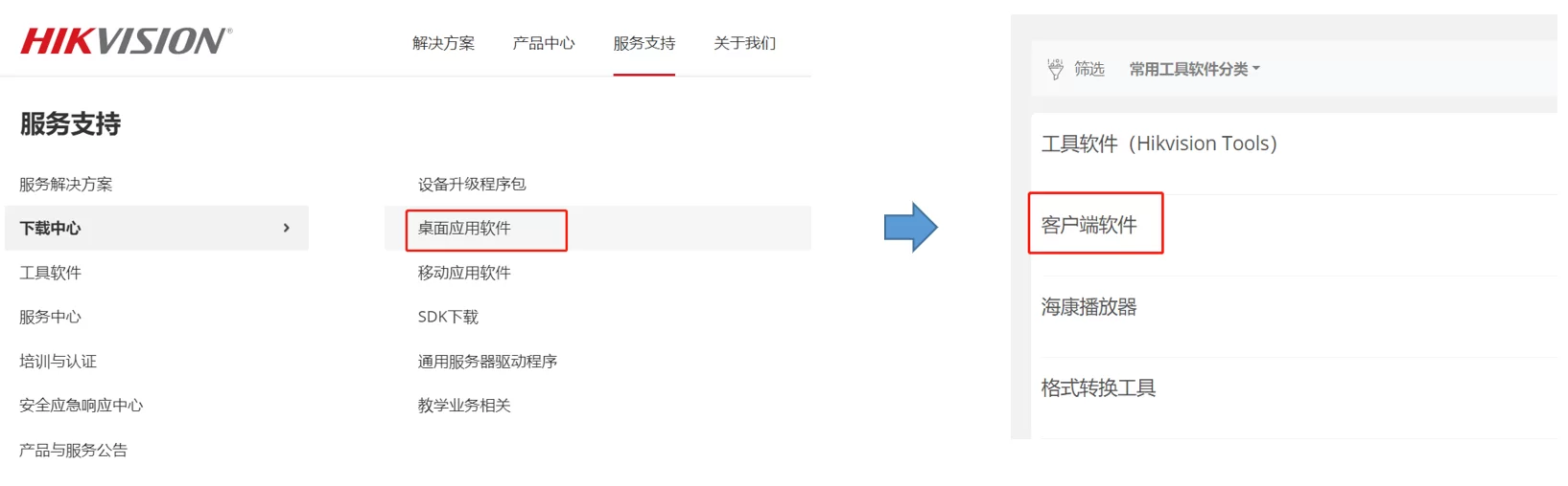 登录海康威视官网,进入服务支持 -下载中心-桌面应用-客户端软件,直接下载iVMS-4200(仅适用windowns系统),或者点击此处下载。