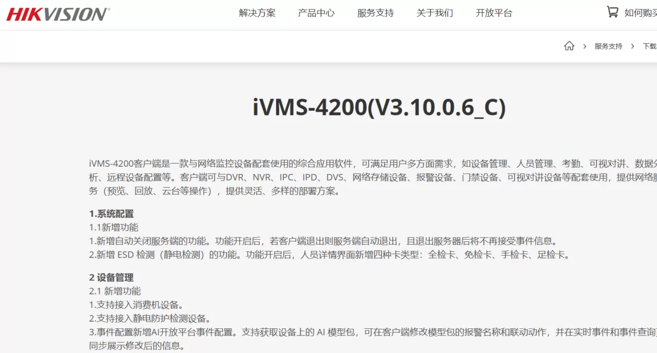 iVMS-4200客户端是一款与网络监控设备配套使用的综合应用软件,可满足用户多方面需求,如设备管理、人员管理、考勤、可视对讲、数据分析、远程设备配置等。客户端可与DVR、NVR、IPC、IPD、DVS、网络存储设备、报警设备、门禁设备、可视对讲设备等配套使用,提供网络服务(预览、回放、云台等操作),提供灵活、多样的部署方案。