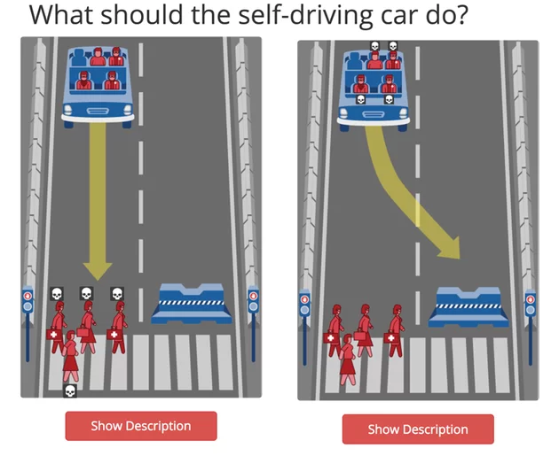 麻省理工学院的研究者在网站(moralmachine.mit.edu)上根据人们自己选择的数据类型,测试他们在机器即将做出决定的情况下表现出的道德直觉。